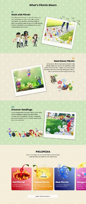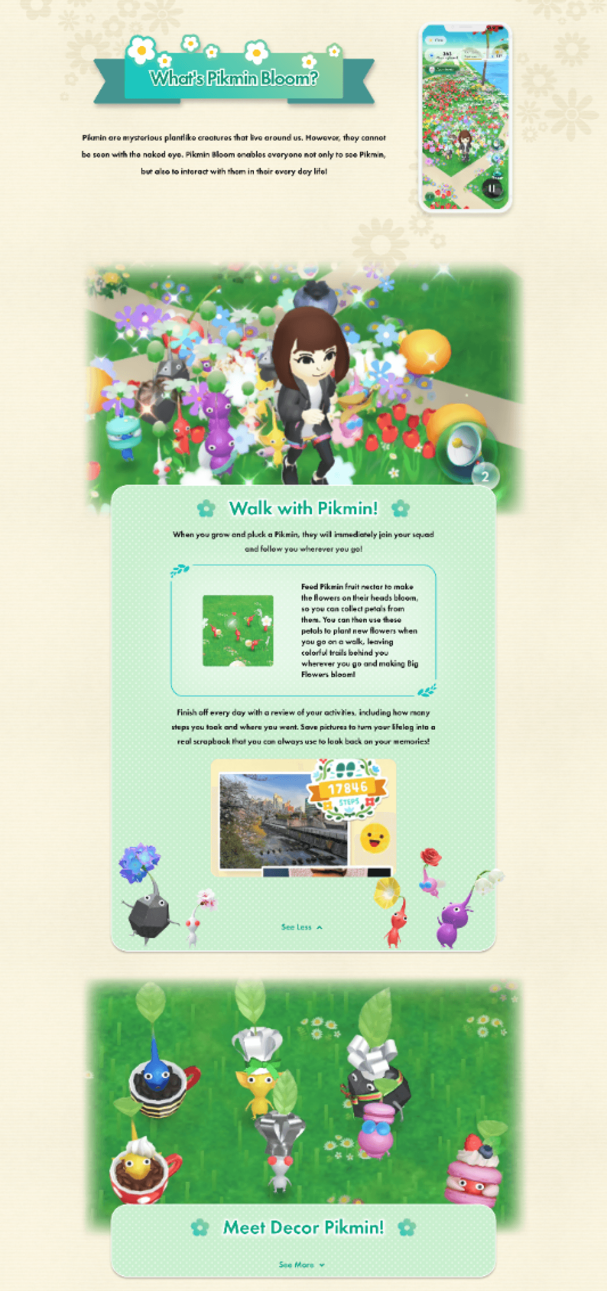 This project improves the Pikmin Bloom website by clarifying its information hierarchy and restructuring content to better match user intent. The redesigned layout helps users quickly understand how the product works, reducing cognitive friction and improving overall scannability.